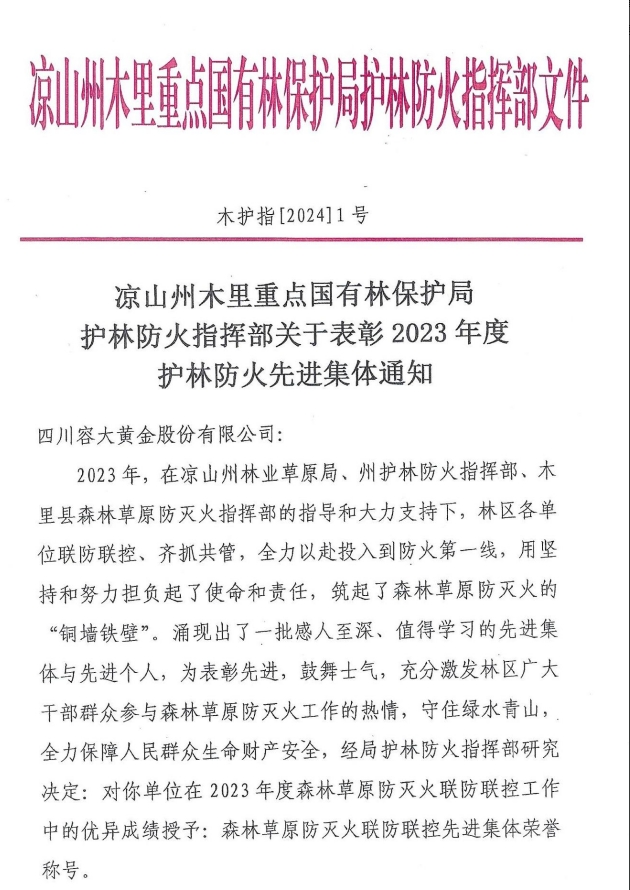-----梭罗沟金矿荣获“2023年度森林草原防灭火工作先进集体”