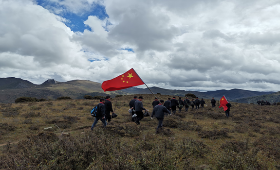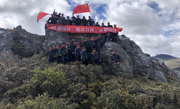 本次徒步登山竞赛活动地点选择在矿区以西灰岩山,终点海拔近4500米。在这山高、路陡、丛林险峻的攀爬过程中,大家相互搀扶、相互帮助、相互鼓励,充分发扬了“容大人”团结拼搏、不畏艰险的优良作风。竞赛经过一个多小时激烈的角逐,山顶裁判传来捷报:综合办员工伍马马率先登上终点,选矿厂女员工姜霞“巾帼不让须眉”紧随其后登顶成功,各队队员也陆续抵达终点。最先到达终点的前三名分获一二三等奖,大家一致推荐把“最佳精神奖”颁给55岁的彭玉洪。每位同事经历这一场高原竞赛,虽然气喘吁吁、精疲力竭,但都充满了到达终点、成功挑战自我的喜悦。大家聚坐在山顶,共赞祖国河山,共颂祖国母亲。